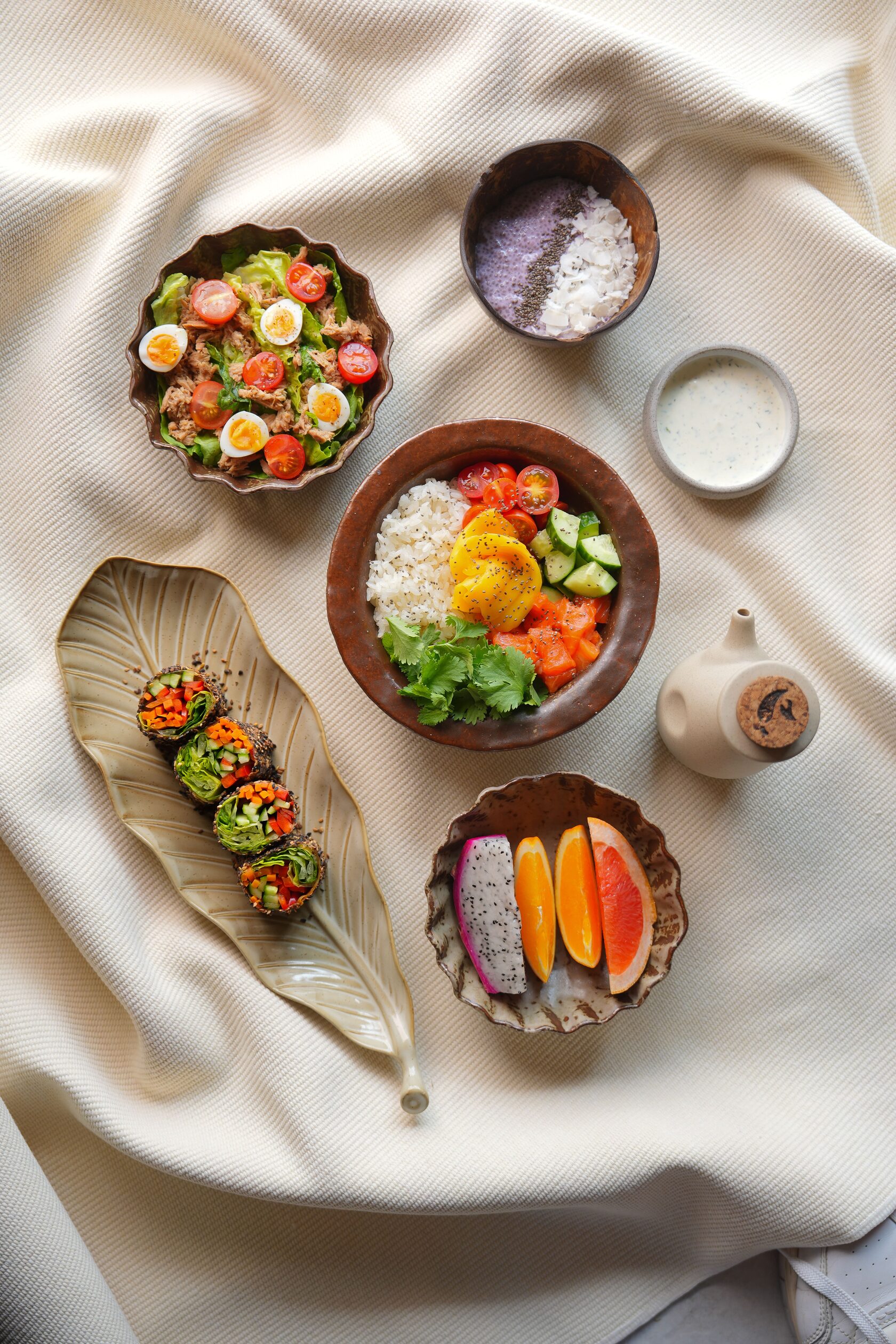 Poke bowl with trout, rice, mango, cucumber and cherry tomatoes Tuna salad with romaine and quail eggs Vegetable fresh roll in rice paper Chia bowl with coconut chips Fresh fruits Coffee of choice