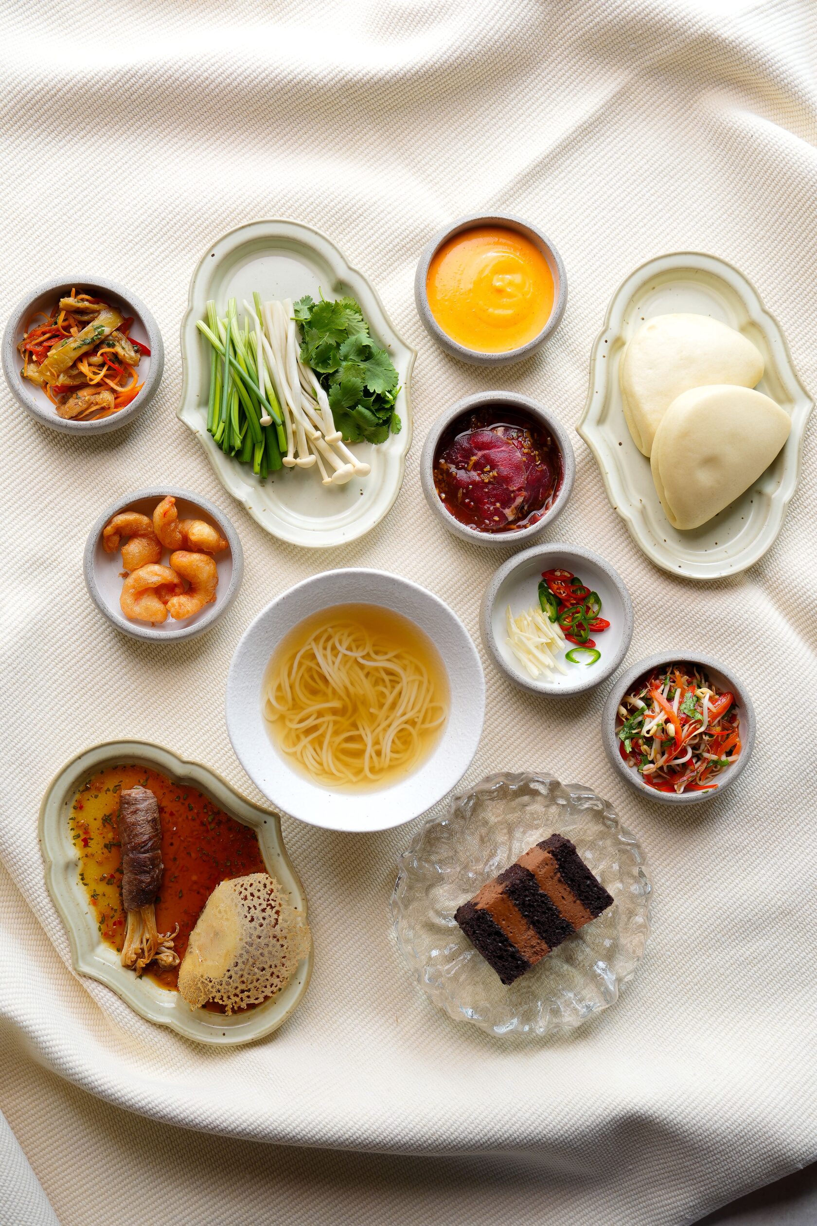 Beef broth with noodles and fresh tenderloin Tempura shrimp Gyoza Enoki with veal Bao bun Salad appetizers: Eggplant he Sprouted mash salad Chocolate dessert Coffee of choice (Cappuccino / Americano / Espresso)