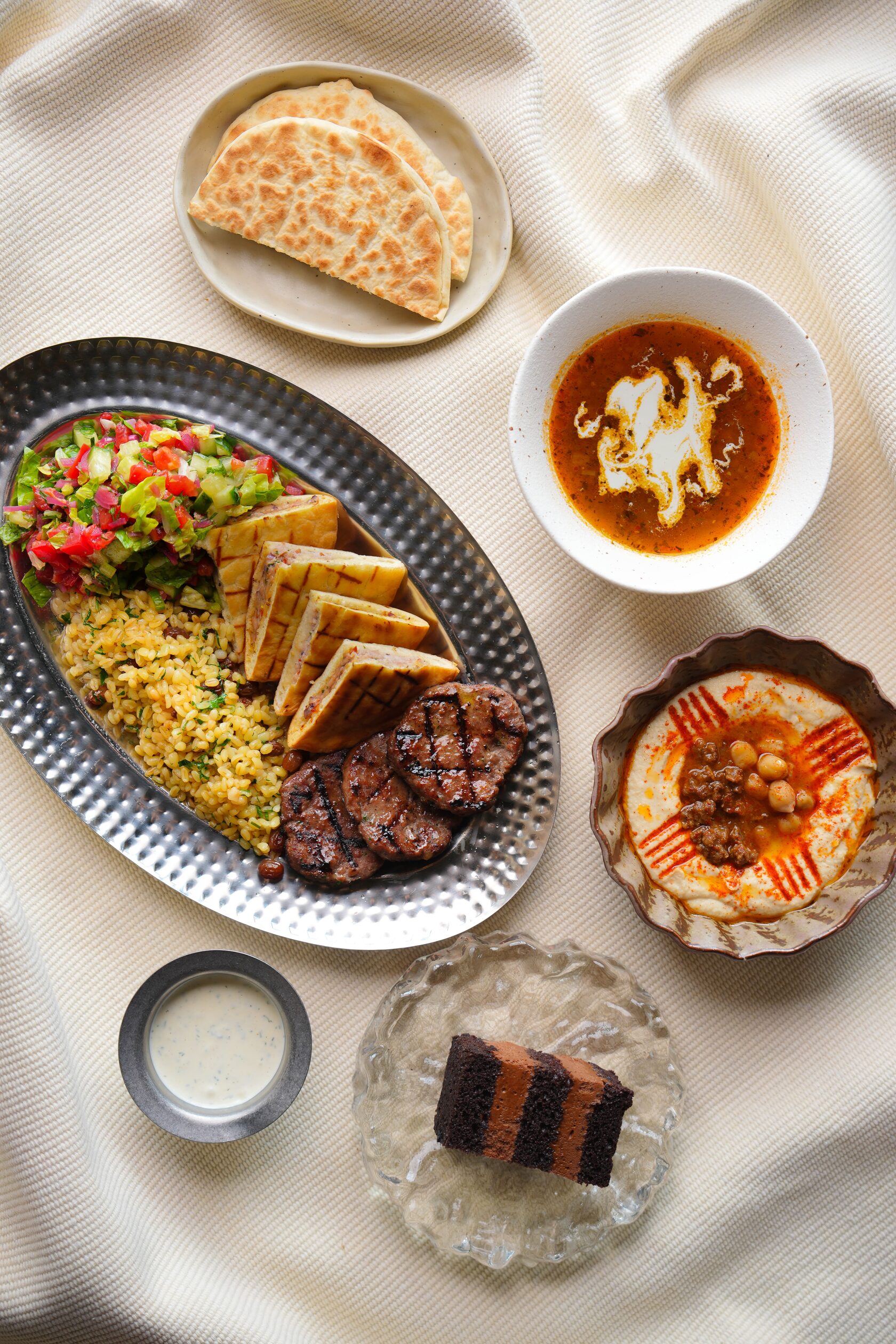 Lentil soup Beef kofta Bulgur with raisins Hummus with minced beef Arabic flatbread with chicken Greek flatbread Vegetable salad with herbs and narsharab Greek yogurt-based sauce Chocolate dessert Coffee of choice