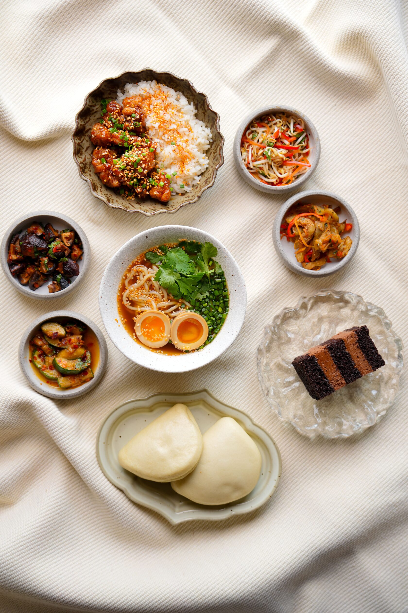 Ramen with noodles Teriyaki chicken with rice Bao bun Salad appetizers: Sprouted mash salad Eggplant he Smashed cucumbers Marinated shiitake mushrooms Chocolate dessert Coffee of choice
