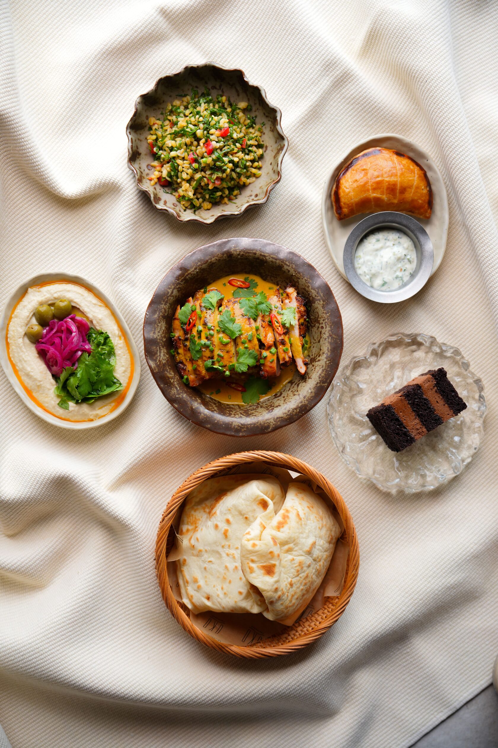 Chicken curry with rice Pumpkin samosa Hummus with olives and herbs Flatbread with tapenade Tabbouleh salad Tzatziki sauce Chocolate dessert Coffee of choice